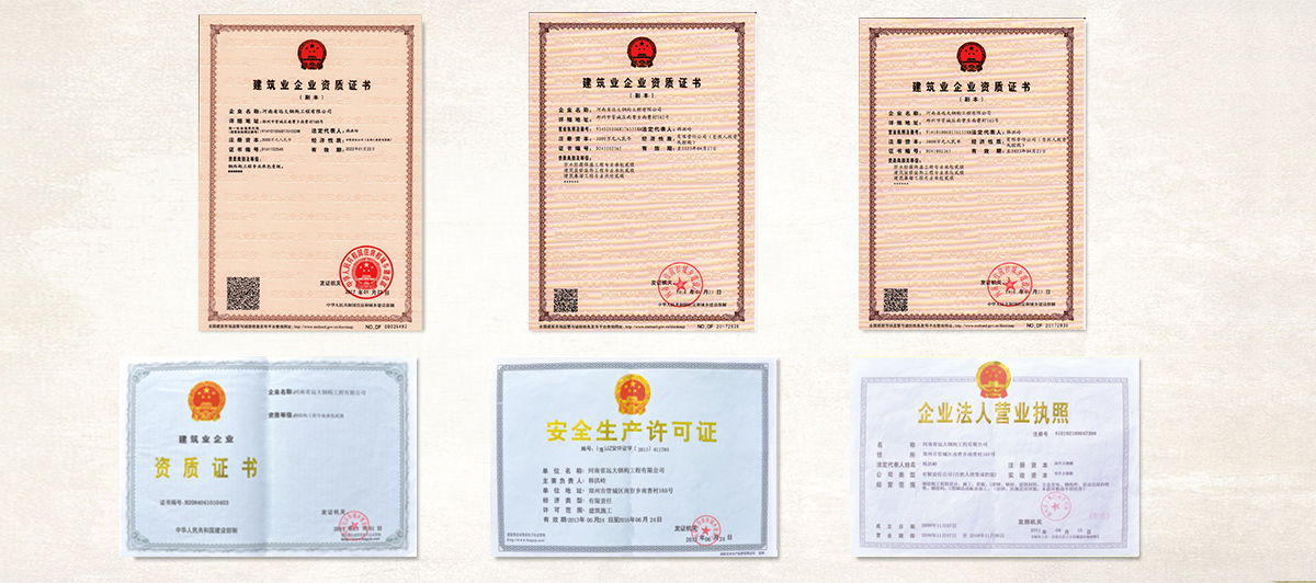 公司擁有“鋼結構制造壹級”和“鋼結構工程專業承包壹級”專業資質,獲得業內認可的各類專利及榮譽資質證書;公司及產品已通過了ISO9001質量管理體系認證和省級檢測、鑒定,安全耐用。